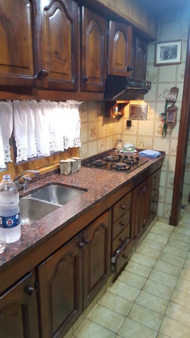 COCINA con mesada granito, mueble bajo mesada y alacenas en madera, artefacto de cocina, spar, heladera.