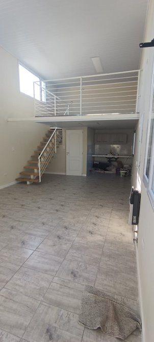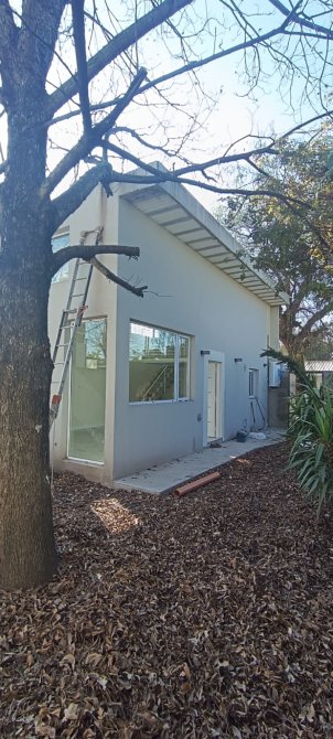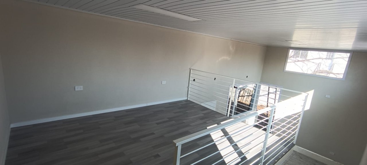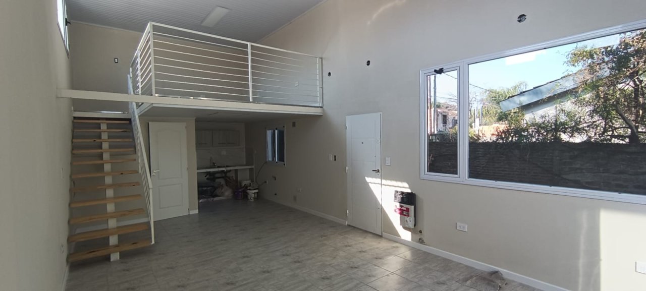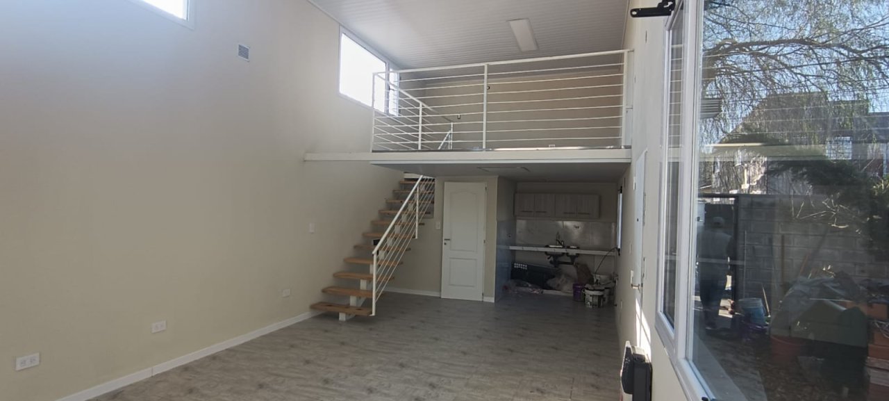 Cocina comedor integrada, con amplios ventanales. Dormitorio en planta alta. Baño. Jardín.